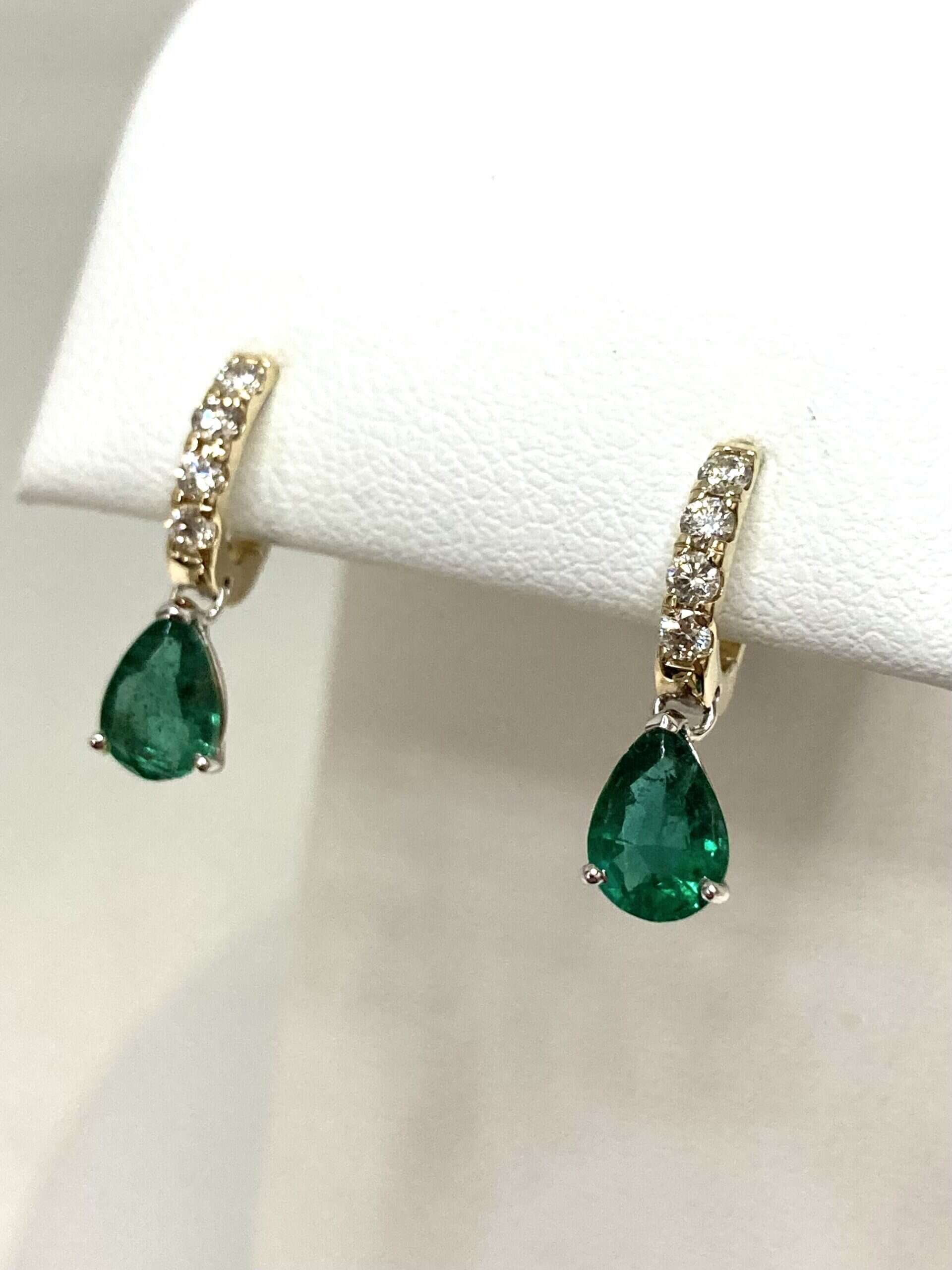 / 14K Yellow Gold Emerald and Diamond Pear Shaped Earrings