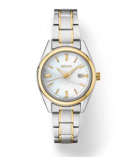 From the Essentials Collection. With classic dress/sport styling, this perfectly tailored design combines sophisticated minimalism with versatility. The elegant mother-of-pearl dial features a date calendar and LumiBrite hands. In stainless steel with two-tone finish, and sapphire crystal for superior scratch resistance. 10 bar, 100M Water Resistant